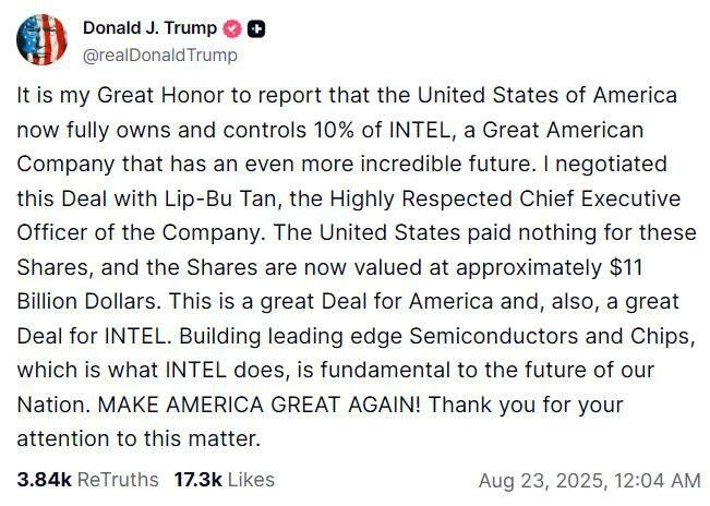«Соединенные Штаты Америки теперь полностью владеют и контролируют 10 процентов компании Intel, великой американской компании, у которой впереди еще более удивительное будущее», — написал он в своей соцсети Truth Social.