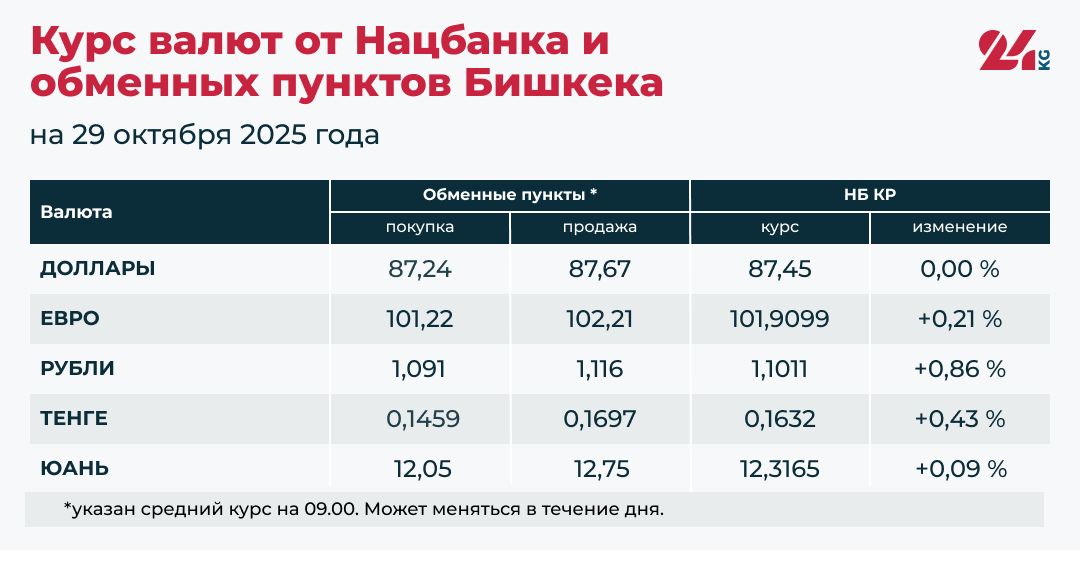 • Средний курс в обменных пунктах: покупка — 87,24 сома, продажа — 87,67 сома.