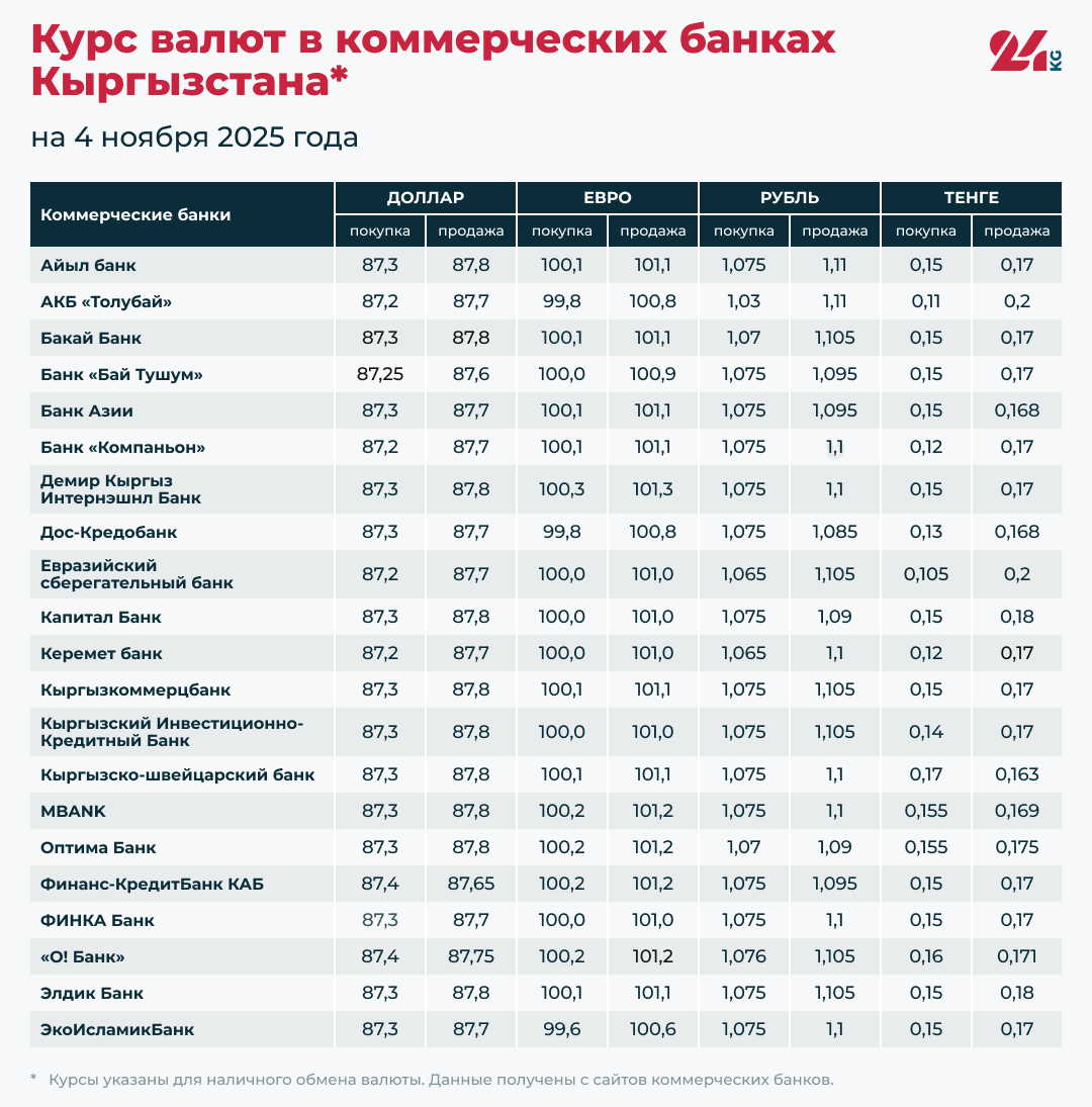 Курс валют в коммерческих банках Кыргызстана на 4 ноября