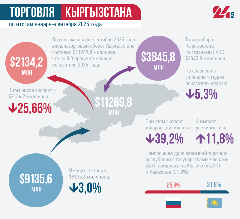 Здесь ситуация для Кыргызстана тоже не самая радужная. Так, по сравнению с январем — сентябрем 2024-го объем торговли уменьшился на 5,3 процента. Всего за девять месяцев со странами ЕАЭС Кыргызстан наторговал на $3 миллиарда 845,8 миллиона.