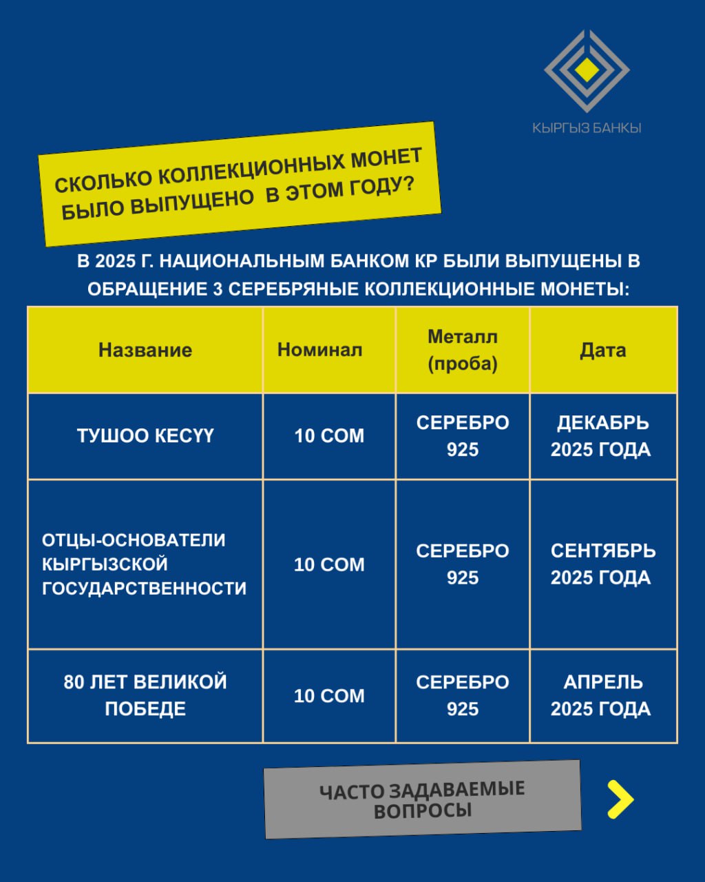 Также спросом пользовались серебряные монеты «80 лет Великой Победе», «Предмет быта: кыргызская ваза» и «100-летие национально-освободительного восстания 1916 года».
