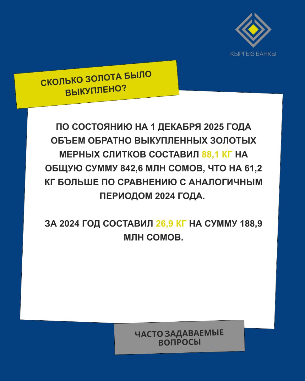 Обратный выкуп слитков также вырос: за 11 месяцев этого года Нацбанк выкупил 88,1 килограмма на 842,6 миллиона сомов, что на 61,2 килограмма выше показателя прошлого года (26,9 килограмма).