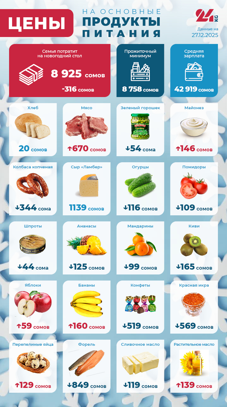 Стоимость минимального набора продуктов для празднования Нового года за год снизилась на 316 сомов и составила 8 тысяч 925 сомов. По сравнению с 2023-м, корзина подешевела на 283 сома.