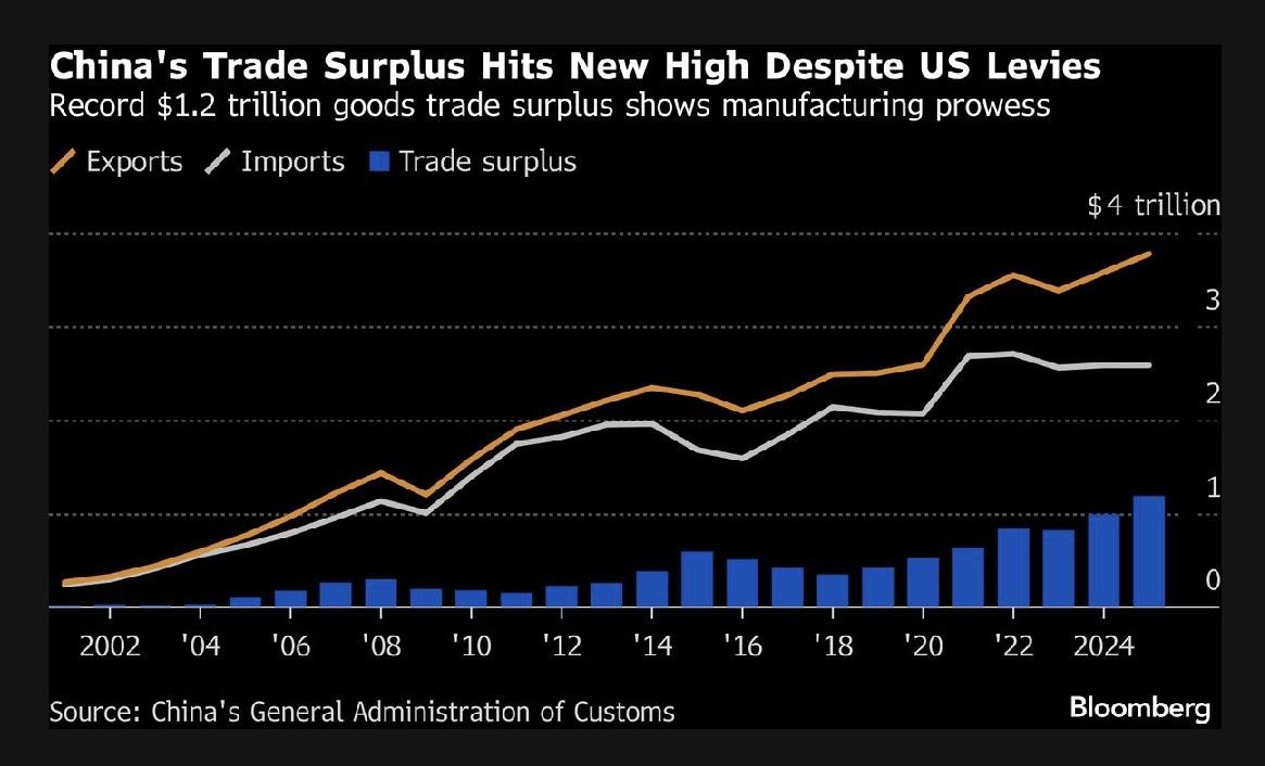 Китай достиг рекордного профицита торгового баланса в 2025-м, составившего $1,2 триллиона.