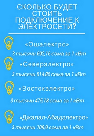 Возмущение экспертов обосновано расчетами. Например, при открытии небольшого нового предприятия в Ошской области, которое будет использовать примерно тысячу киловатт, учредителям, кроме строительства здания, приобретения оборудования и других расходов, надо заплатить «Ошэлектро» 3 миллиона 692 тысячи 160 сомов за подключение к сети. Сумма немаленькая, и это может затормозить открытие новых предприятий.