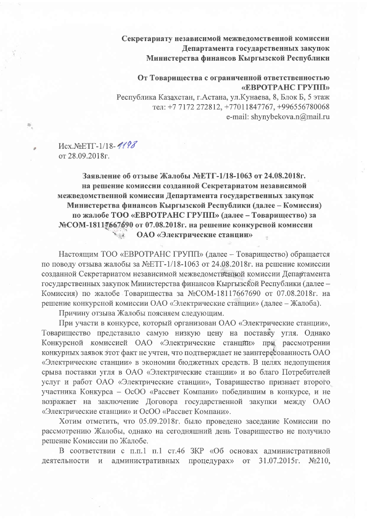 Однако в письме от 28 сентября «Евротранс групп» признает ОсОО «Рассвет компани» победителем конкурса и отзывает свою жалобу. Кроме того, компания не возражает относительно заключенного договора между «Рассвет компани» и ОАО «Электрические станции».