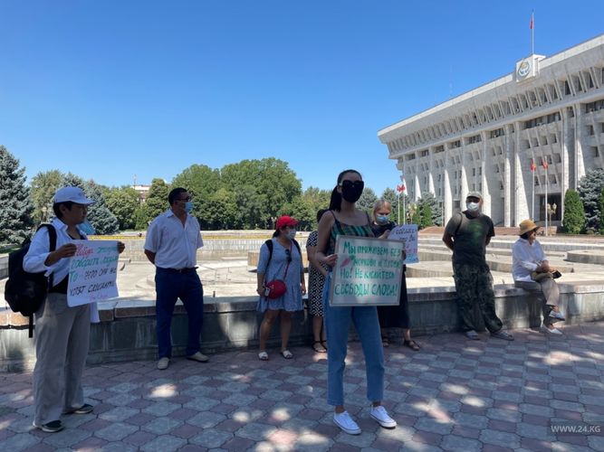 Rally against censorship and Gulshat Asylbayeva’s bill on protection from false and inaccurate information is held near the White House in Bishkek.