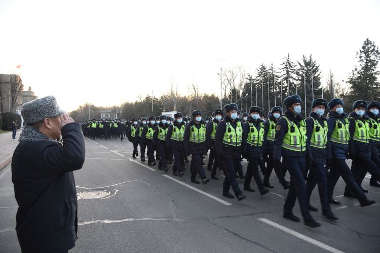 Relief of the guard and a briefing of the internal affairs bodies of the Bishkek garrison took place today on the Old Square. The Deputy Minister of Internal Affairs Oktyabr Urmambetov attended the ceremony.