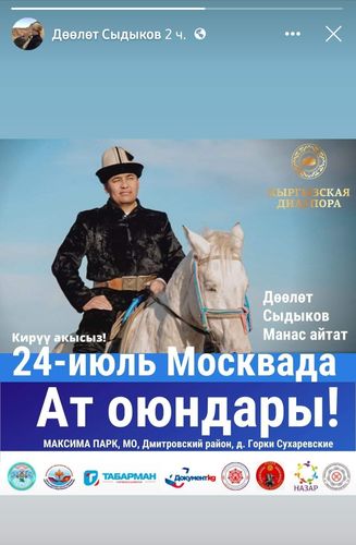 Equestrian Games will be held in Dmitrievsky district of Moscow Oblast on July 24. Doolot Sydykov will perform there. Admission is free.