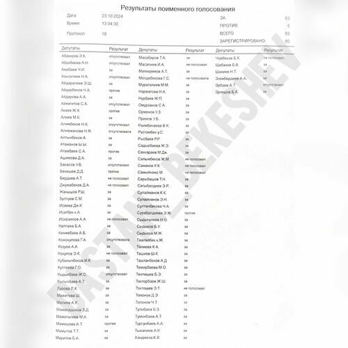 Deputy Dastan Bekeshev published the results of the vote on the bill in his Telegram channel. Only six deputies voted against the initiative: Chingiz Aidarbekov, Zhanar Akayev, Seidbek Atambayev, Dastan Bekeshev, Aisuluu Mamashova and Elvira Surabaldieva.