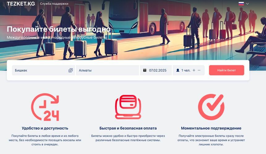 On the website https://tezket.kg/, passengers can book tickets online up to 10 days before departure for international and intercity bus routes by selecting the route, departure date, and number of passengers. After choosing the route, users need to fill out a form and pay for the ticket.