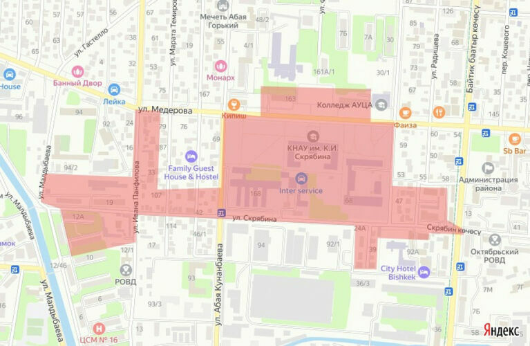 The shutdown area includes Skryabin Street — Abay Street — Radishchev Street — Baytik Baatyr Street — Mederov Street — Abay Street — Tynystanov Street — Mederov Street — Skryabin Street — Maldybaev Street — Mederov Street — Baytik Baatyr Street.