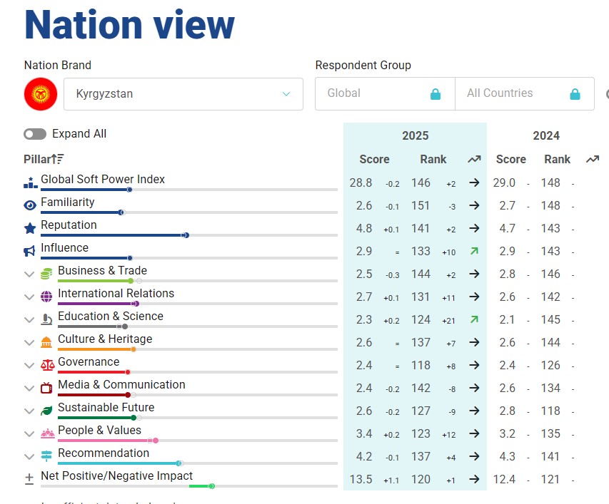 Kyrgyzstan has moved two positions up in the Global Soft Power Index 2025, ranking 146th with 28.8 points. The ranking has been compiled by the consulting organization Brand Finance for six years in a row.