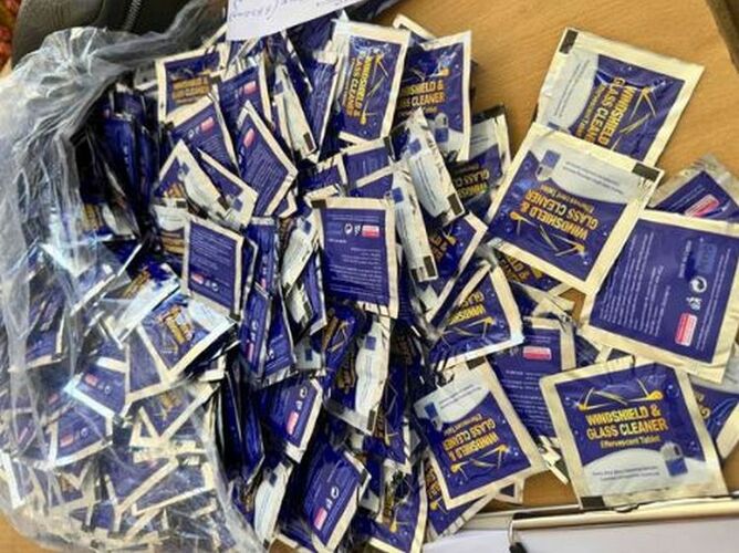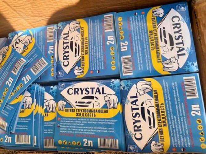 During the inspection, officers found 45 tons of a colorless liquid, presumably industrial alcohol, along with a large stock of labels, caps, containers, and finished products including antifreeze, windshield washer fluid, and other chemicals.