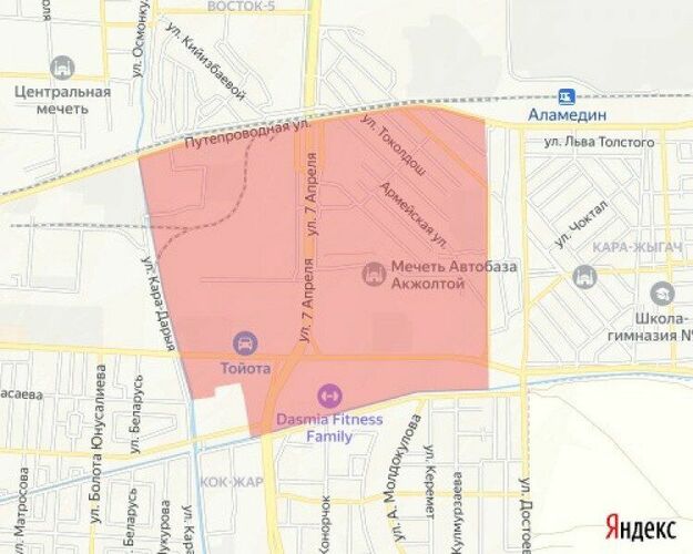 - Ankara Street — Eastern Big Chui Canal, Alamedin River, the railway line, and Oktyabrskaya Street.