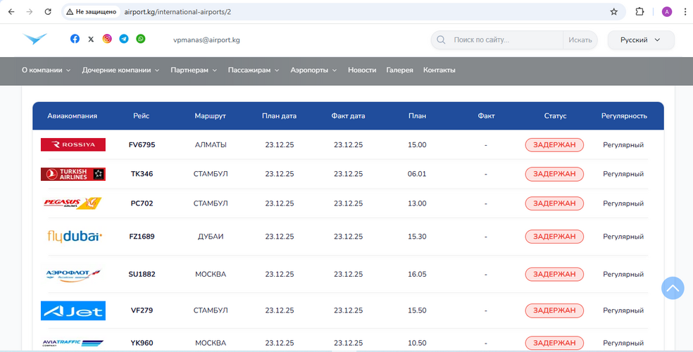 Flights are being delayed at Manas International Airport due to dense fog, according to information displayed on the airport’s flight information board.