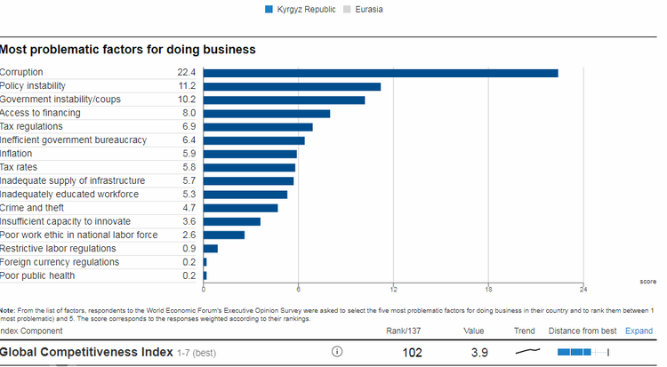 According to the WEF, Kyrgyzstan is hampered in its development by corruption, political instability, coups, bureaucracy, tax rates, inadequate supply of infrastructure, inadequately educated workforce.