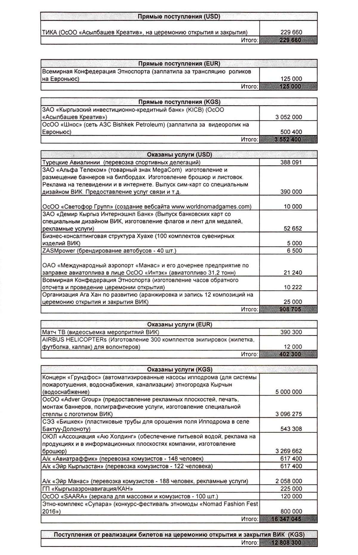 Из спонсорских средств большего всего выделили ОсОО «Альянс алтын» ($200 тысяч), частные предприниматели ($100 тысяч) и ОсОО «Сити-центр» (14 миллионов сомов).