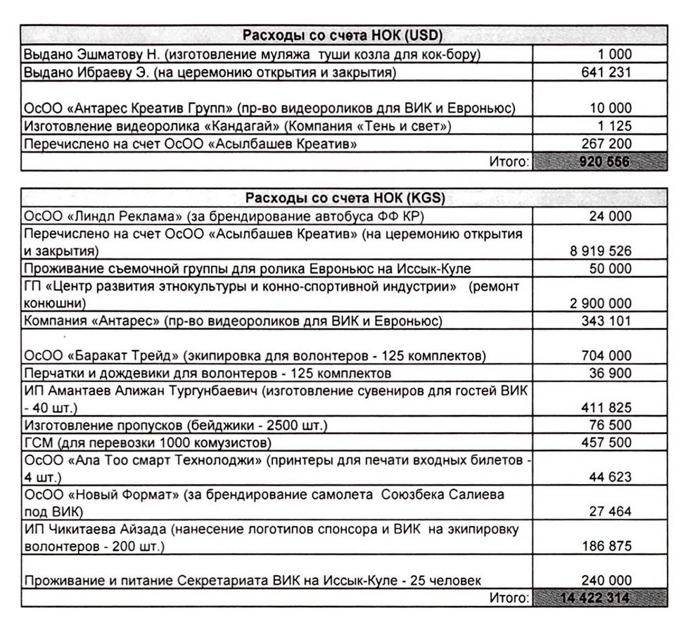 На середину октября на счете Госпредприятия «Центр развития этнокультуры и конноспортивной индустрии» при Госагентстве по делам молодежи, физкультуры и спорта от продажи билетов находится 12 миллионов 808 тысяч 300 сомов. Еще 248 тысяч 742 сома и $25 тысяч на счете Национального олимпийского комитета КР.