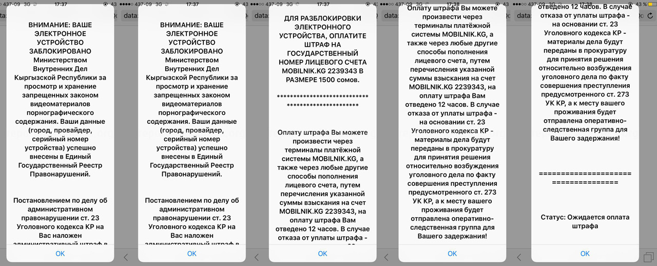 По ее данным, злоумышленники внедряют в мобильные устройства и компьютеры вредоносные программы, которые блокируют работу браузера. На экран выводится сообщение о блокировании устройства якобы МВД КР - из-за посещения запрещенного интернет-контента - и требование заплатить для разблокирования штраф (1,5 тысячи сомов) на государственный кошелек с указанием реквизитов. «Злоумышленники могут рассылать сообщения подобного характера, но с другим содержанием», - отметили в МВД.