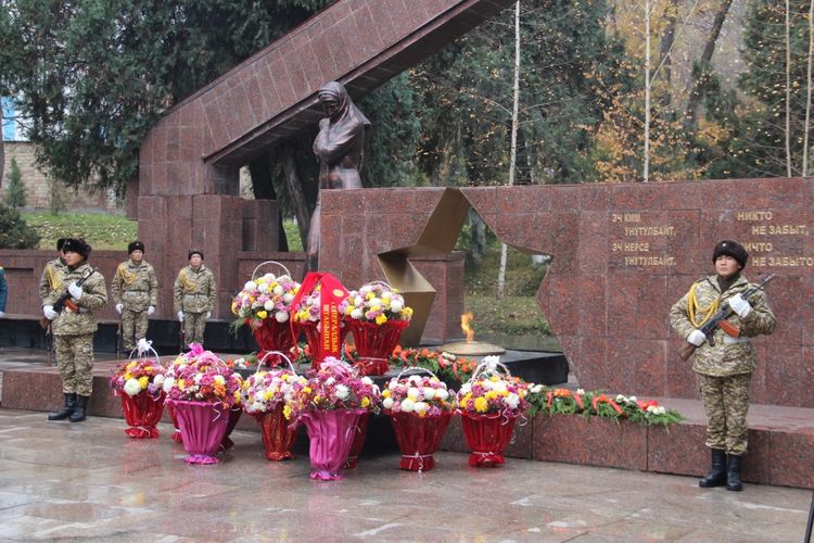 Иш-чарага келген мэриянын өкүлдөрү, шаардык мекемелердин жетекчилери «Өчпөс от» мемориалдык комплексине гүлчамбар коюп, ата-бабаларга куран окушту.