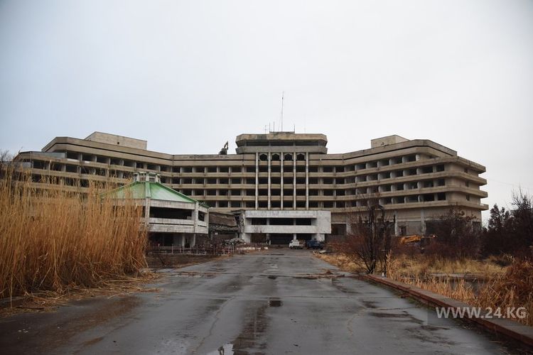 Учурда Бишкектеги «Ысык-Көл» мейманканасы сүрдүрүлүүдө. 15 жумушчу атайын техника менен имаратты бузуп, ордун тазалоого киришти.