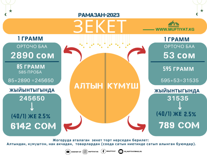 Зекетке ошол байлыктын кырктан бир бөлүгү, башкача айтканда 2.5 пайызы берилет. Зекеттин (нисабы) өлчөмү алтын эсебинде 20 (мискалга) алтынга барабар. 20 мискал орто эсеп менен 85 грамм алтынга туура келет. Ал эми күмүштүн өлчөмүнө караганда 595 граммга туура келет. Кыргызстанда 1 грамм (жасалга болбогон) алтындын орточо баасы 2 миң 890 сом. Ал эми 1 грамм уюутулган күмүштүн баасы 53 сом.