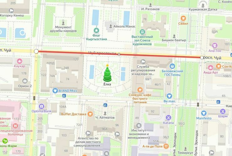 Жол кыймылы Чүй проспектиси боюнча Панфилов көчөсүнөн Эркиндик бульварына чейин чектелет.