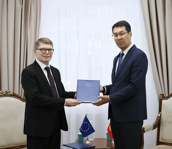Евробиримдиктин Кыргызстандагы өкүлчүлүгүнүн жаңы жетекчиси дайындалды. Тышкы иштер министринин орун басары Медер Абакиров Евробиримдиктин Кыргызстандагы өкүлчүлүгүнүн жаңы дайындалган жетекчиси Реми Дюфлодон ишеним грамотасынын көчүрмөсүн алды.