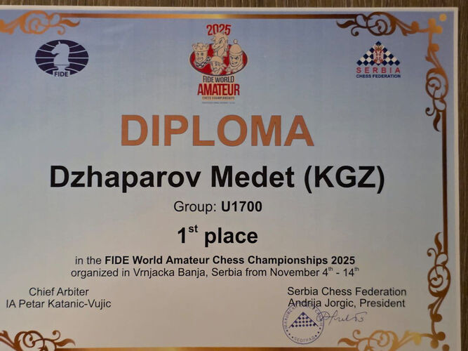 Каракол шаарынын тургуну Медет Жапаров ФИДЕнин шахмат сүйүүчүлөрүнүн дүйнө чемпионатында биринчи орунду ээледи. Жеңүүчү 24-kg.com басылмасына билдиргендей, мелдеш Сербиянын Врнячка-Баня курорттук шаарында өттү.