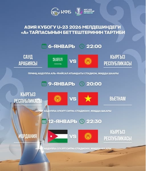 Эртең, 6-январда старт ала турган континенталдык биринчиликке Азиянын 16 мыкты курама командаларынын беттеши Сауд Арабиясынын Жидда шаарында башталат.Бул тууралуу Кыргыз футбол биримдиги билдирди