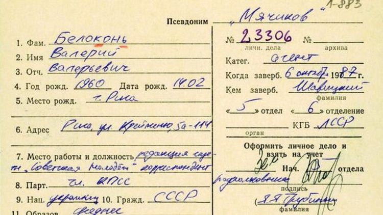 В архиве есть карточка на имя Валерия Белоконя, 1960 года рождения. Агент под псевдонимом «Мячиков» работал корреспондентом газеты «Советская молодежь».
