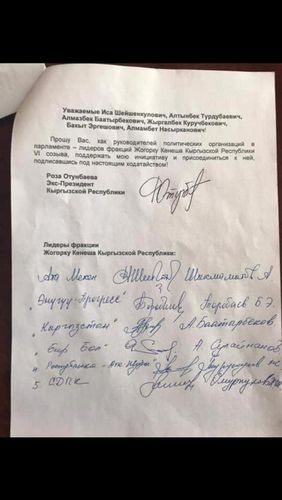 Уточняется, что бывший глава государства Роза Отунбаева призвала фракционных лидеров поддержать ее. Алмамбет Шыкмаматов («Ата Мекен»), Бакыт Торобаев («Онугуу-Прогресс»), Алмазбек Баатырбеков («Кыргызстан»), Алтынбек Сулайманов («Бир Бол»), Жыргалбек Турускулов («Республика — Ата Журт») и Иса Омуркулов (СДПК) поддержали Розу Отунбаеву единогласно.