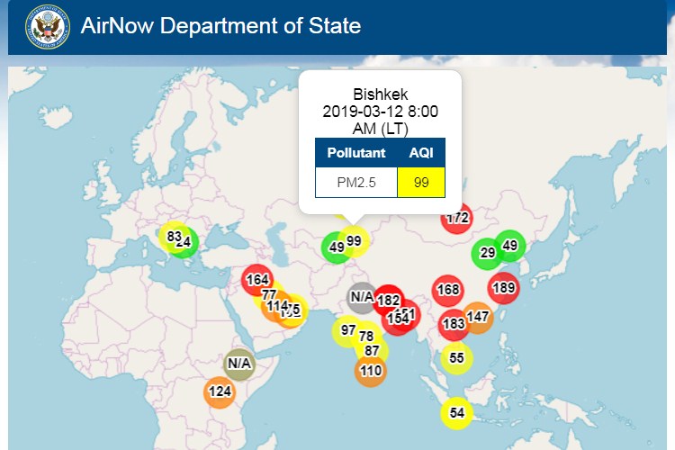 Посольство США в Кыргызстане также установило датчик, измеряющий уровень загрязнения воздуха. Информация обновляется ежечасно.