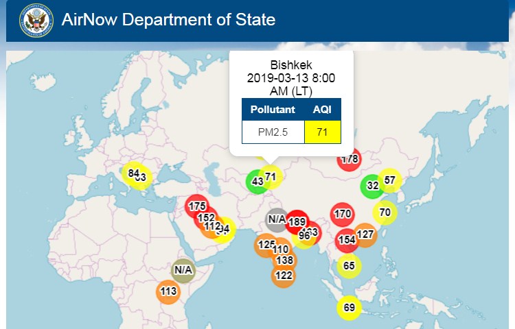 Посольство США в Кыргызстане также установило датчик, измеряющий уровень загрязнения воздуха. Информация обновляется ежечасно.