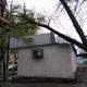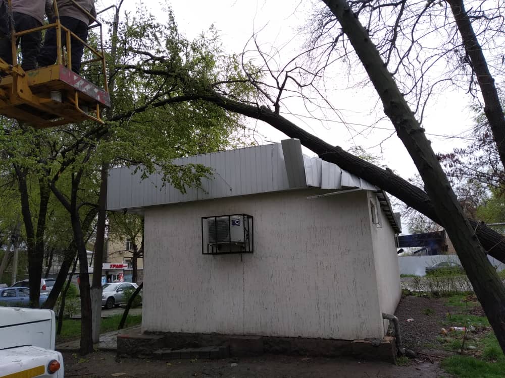 На пересечении улиц Туголбай Ата и Раззакова упал молодой дуб. Дерево повредило часть крыши павильона, располагавшегося рядом. Владелец торговой точки претензий не имеет.