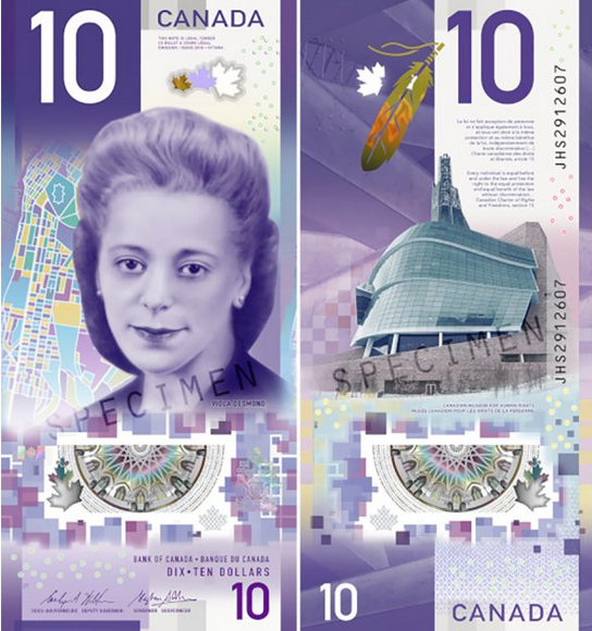 С одной стороны купюры 10 канадских долларов изображена предприниматель Виола Десмонд, известная борьбой с расовой дискриминацией, на другой стороне — Музей прав человека в Виннипеге.