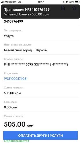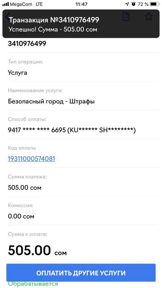 «За полученный штраф превышения скорости «Безопасного города», воспользовавшись скидкой 50 процентов, я оплатил 500 сомов со своей зарплатной карты через мобильное приложение. Это заняло у меня не больше минуты. Как видите, комиссия банка составила всего 5 сомов, хотя если бы оплачивали традиционным путем или через отделения «Кыргыз почтасы», то комиссия составила бы от 20 до 35 сомов», — написал Кубаныч Шатемиров.