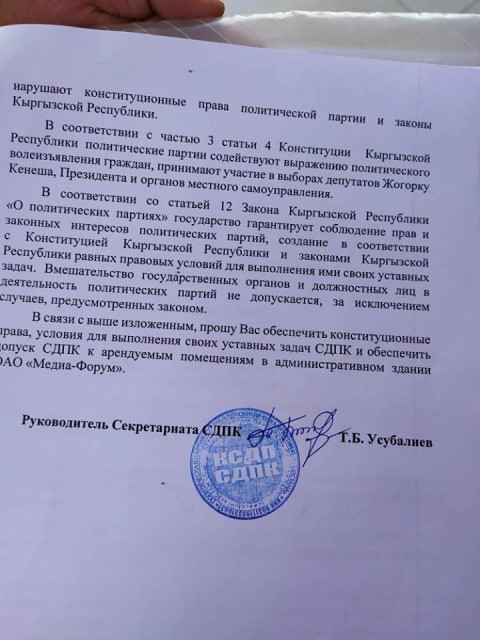 Кундуз Жолдубаева добавила, что государство гарантирует соблюдение прав и законных интересов партий. «Вмешательство государственных органов и должностных лиц в деятельность политических партий не допускается, за исключением случаев, предусмотренных законом. Прошу обеспечить конституционные права, условия для выполнения уставных задач и допуск СДПК к арендуемым помещениям в административном здании ОАО «Медиа Форум», — заключила она.