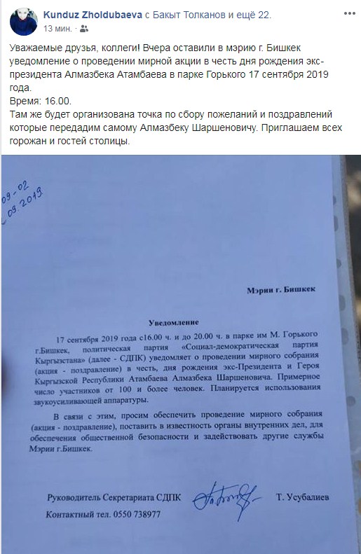 По ее словам, сторонники Атамбаева оставили в мэрии Бишкека уведомление о проведении мероприятия в парке Горького 17 сентября 2019 года.