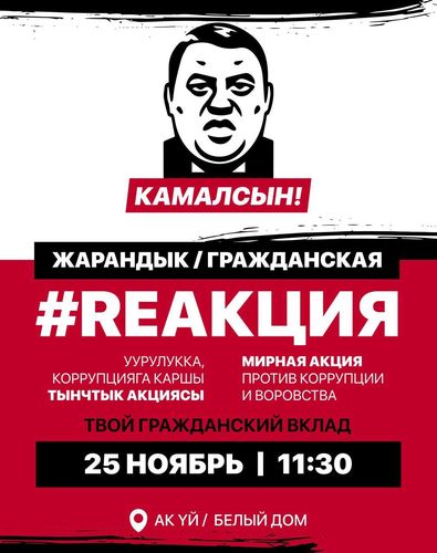 Мирные акции против коррупции пройдут в Бишкеке и Караколе. Митинг запланирован на 25 ноября, начало в 11.30, в столице Кыргызстана — у здания «Белого дома», в Караколе — возле обладминистрации.