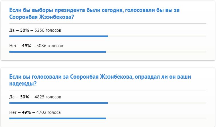 Сооронбай Жээнбеков оправдал надежды ровно половины читателей 24-kg.com. Они готовы проголосовать за него снова. Таковы результаты опроса, который опубликовали в минувшее воскресенье.
