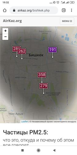 - в районе улиц Бейшеналиевой/Токтогула. Уровень загрязнения превышен в 4,31 раза: PM2.5 среднесуточный — 151 мкг/м³, на момент измерения — 281 мкг/м³;