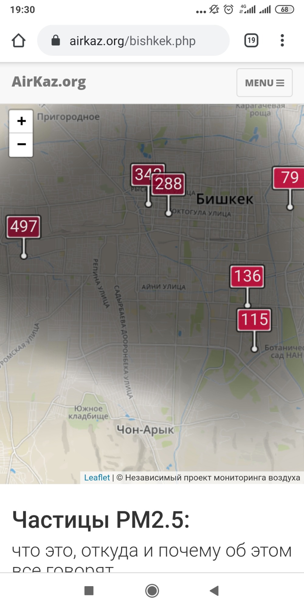 - жилмассив «Ак-Орго». Уровень загрязнения превышен в 5,74 раза: PM2.5 среднесуточный — 201 мкг/м³, на момент измерения — 497 мкг/м³;