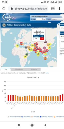 Посольство США в Кыргызстане также установило датчик. Он показывает индекс качества воздуха в режиме онлайн. Информация обновляется ежечасно.
