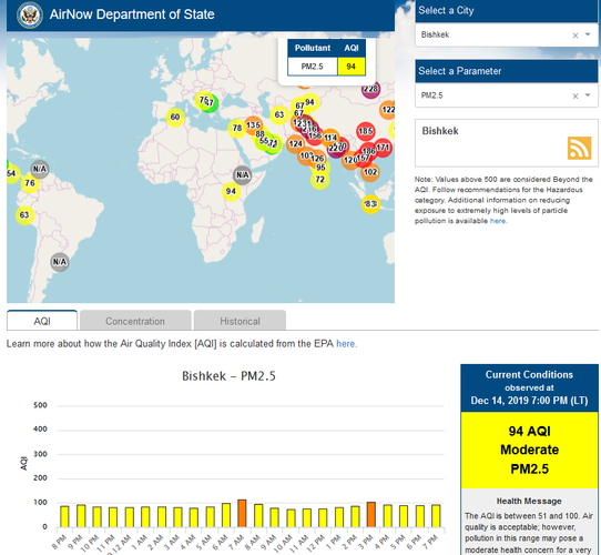 Посольство США в Кыргызстане также установило датчик. Он показывает индекс качества воздуха в режиме онлайн. Информация обновляется ежечасно.