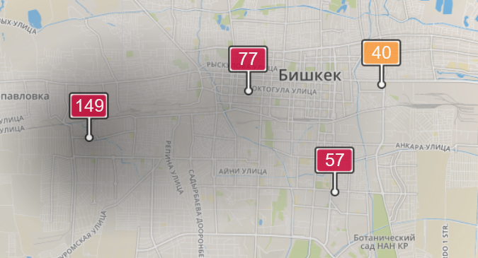 - в жилмассиве «Ак-Орго». Уровень загрязнения превышен в 2,28 раза: PM2.5 среднесуточный — 80 мкг/м³, на момент измерения — 149 мкг/м³;