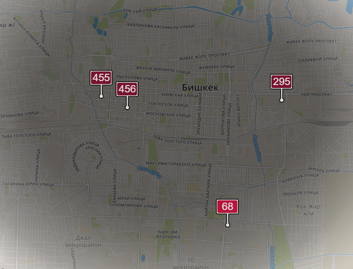 - в районе улиц Московской/Уметалиева. Уровень загрязнения превышен в 11,9 раза: PM2.5 среднесуточный — 419 мкг/м³, на момент измерения — 456 мкг/м³;