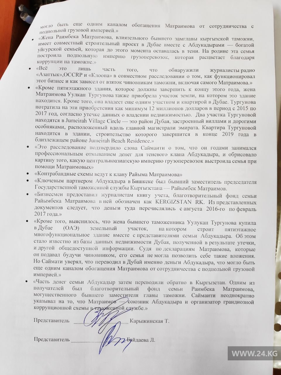 В иске приводится несколько фраз, которые, по мнению семьи Матраимовых, порочат их честь, достоинство и деловую репутацию. К примеру: «это обыкновенный велюр, ткань стоимостью всего 1 доллар за метр поможет раскрыть схемы на сотни миллионов долларов и то, что сотни миллионов долларов были выведены из Кыргызстана становится понятным вот из этих документов. Они раскрывают тайну богатства Матраимовых».
