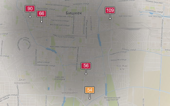 - в районе улиц Бейшеналиевой/Токтогула. Уровень загрязнения превышен в 2,34 раза: PM2.5 среднесуточный — 82 мкг/м³, на момент измерения — 90 мкг/м³;